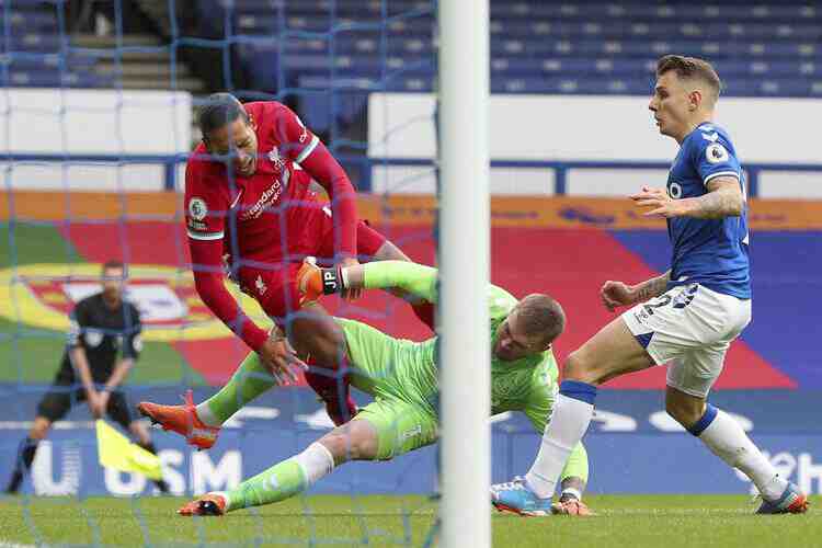 Ceza sahası içine gönderilen ortada Everton kalecisi Pickford’un sert müdahalesine maruz kalan van Dijk acılar içinde yerde kaldı.